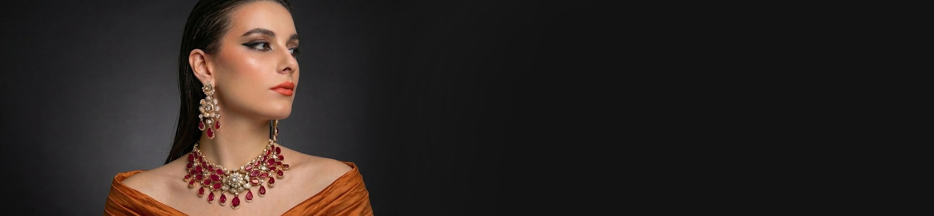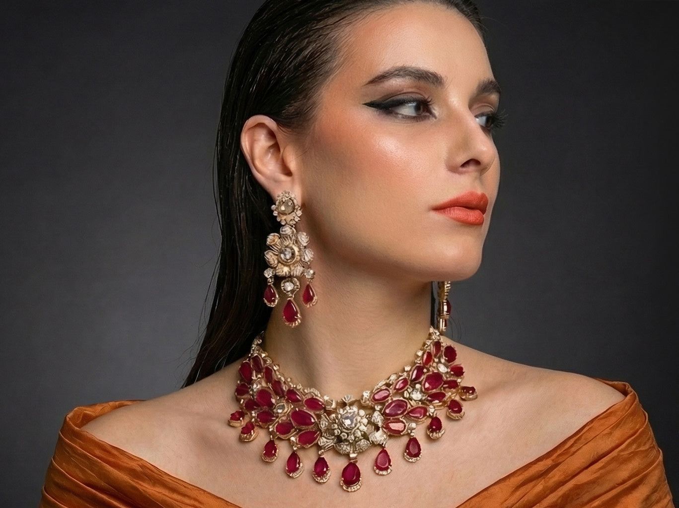 Crimson Crescent Ruby & Polki Collar Necklace & Earrings Set